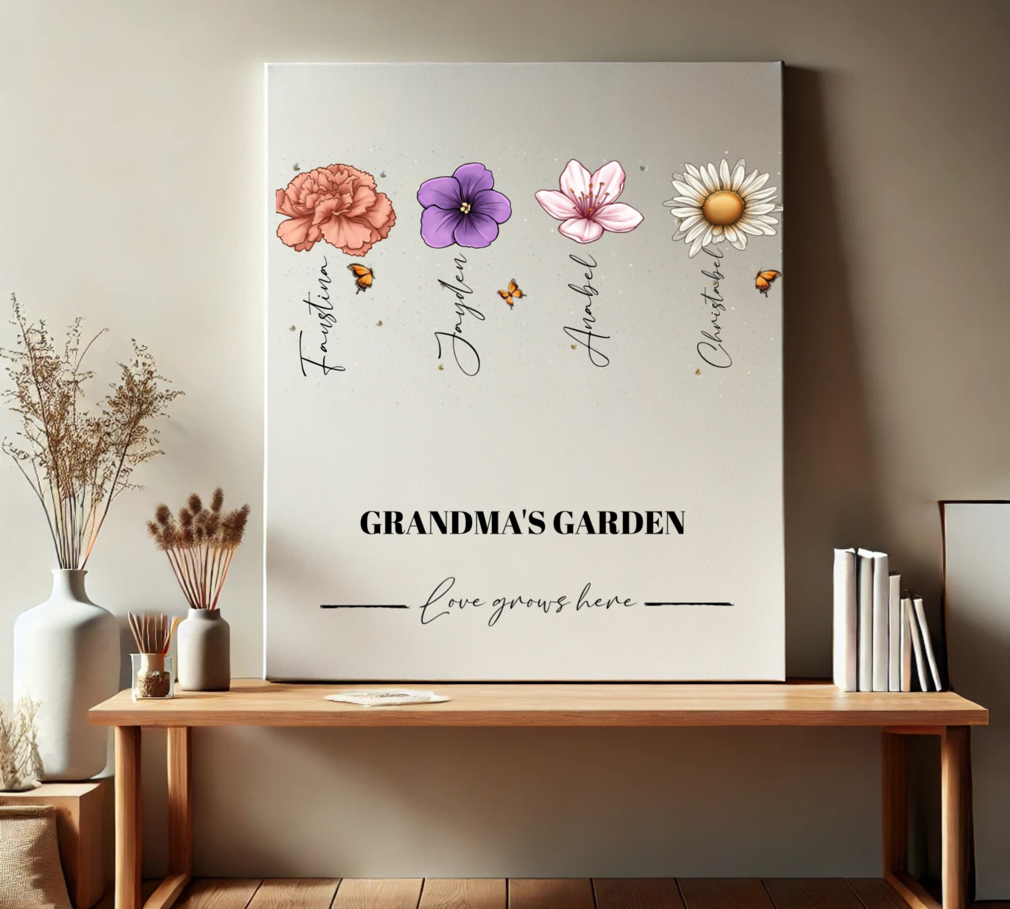 This custom floral canvas beautifully represents Grandma’s (or Mom’s) love for her family. Each child’s name is paired with their birth month flower, creating a sentimental and timeless keepsake.