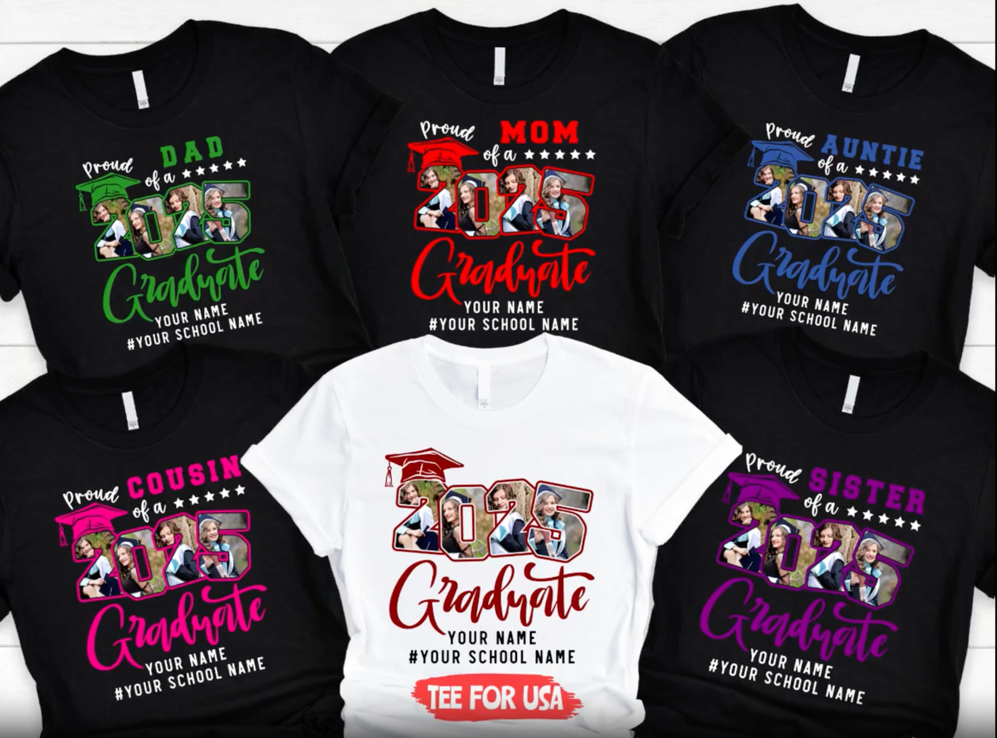 Senior 2025, Family Graduation Shirts, Grad Squad Looks, Custom Personalized Grad Gifts, and more.